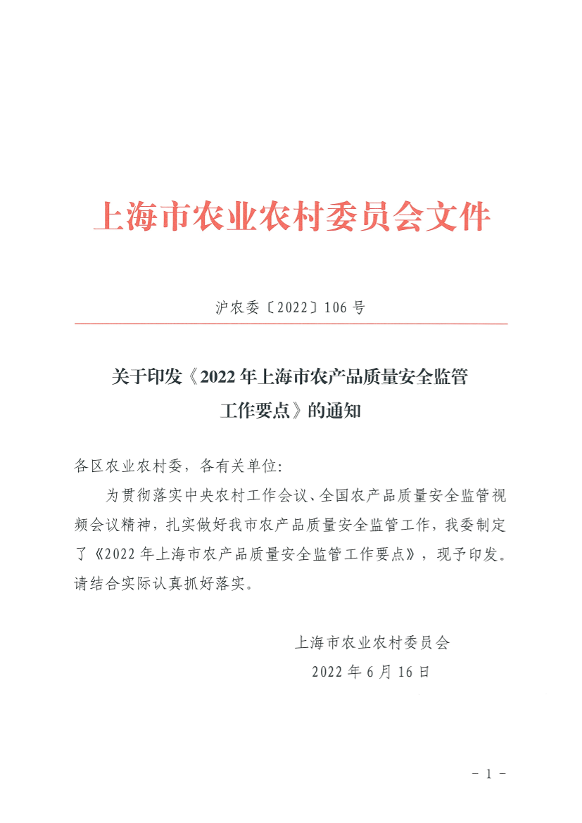 为贯彻落实中央农村工作会议、全国农产品质量安全监管视频会议精神,扎实做好我市农产品质量安全监管工作,我委制定了《2022年上海市农产品质量安全监管工作要点》,现予印发。请结合实际认真抓好落实。