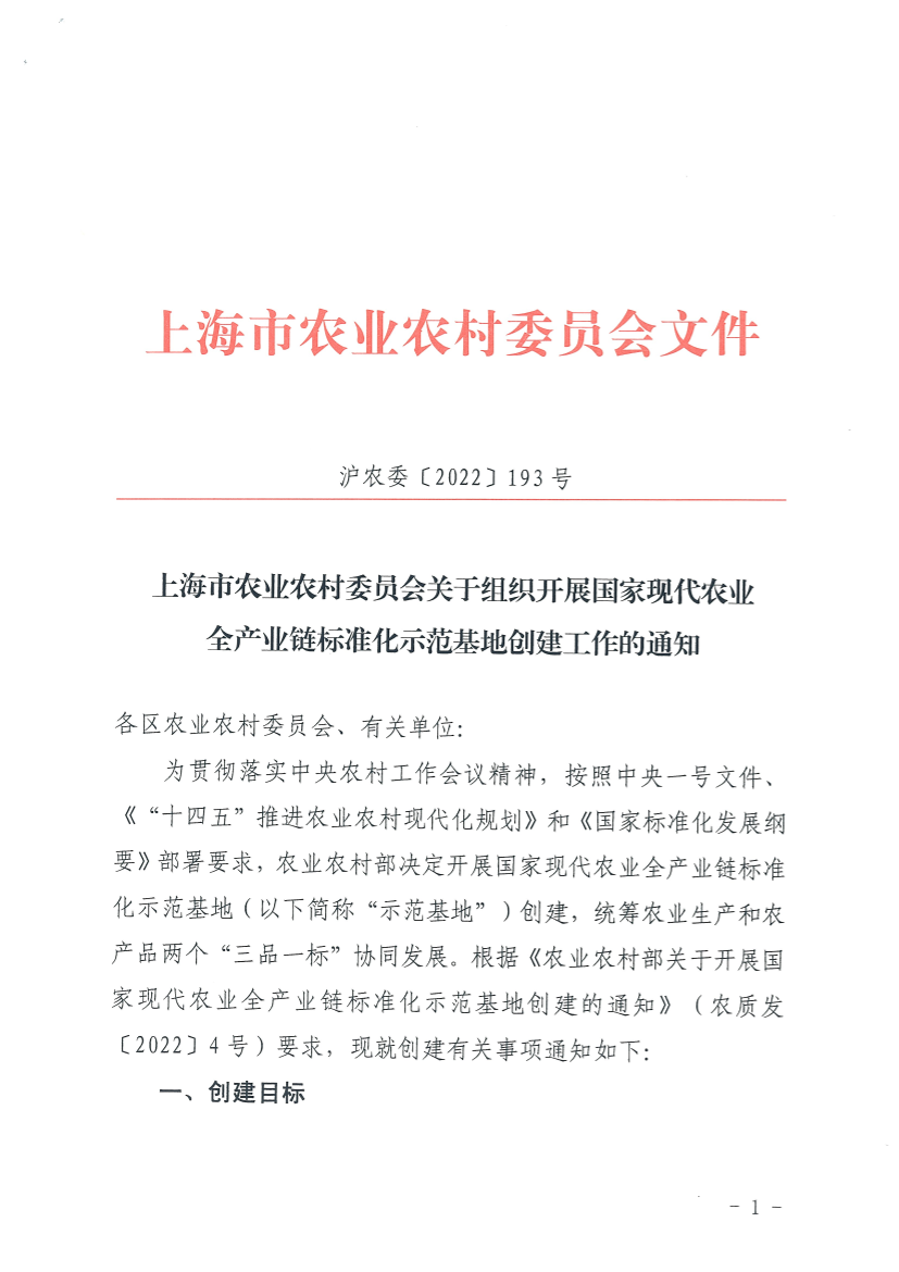 为贯彻落实中央农村工作会议精神,按照中央一号文件、《“十四五”推进农业农村现代化规划》和《国家标准化发展纲要》部署要求,农业农村部决定开展国家现代农业全产业链标准化示范基地(以下简称“示范基地”)创建,统筹农业生产和农产品两个“三品一标”协同发展。根据《农业农村部关于开展国家现代农业全产业链标准化示范基地创建的通知》(农质发〔2022〕4号)要求,现就创建有关事项通知如下: