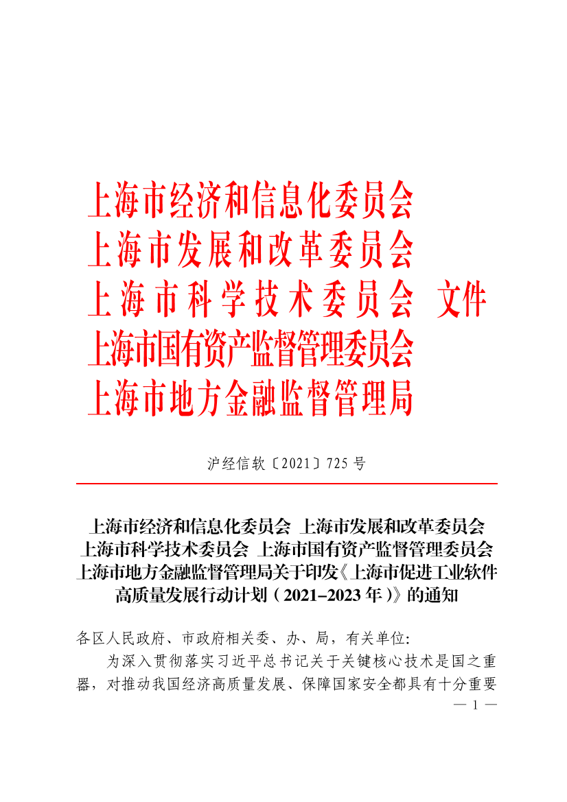 为深入贯彻落实习近平总书记关于关键核心技术是国之重器,对推动我国经济高质量发展、保障国家安全都具有十分重要的意义的指示精神,坚持软件定义制造,加强赋能实体经济能级,全面推进城市数字化转型,全力支撑打响“上海制造”品牌,充分发挥上海工业产业基础雄厚、科技资源密集等优势,市经济信息化委、市发展改革委、市科委、市国资委和市地方金融监管局联合制定《上海市促进工业软件高质量发展三年行动计划(2021-2023年)》。经市政府同意,现印发给你们,请结合实际认真贯彻落实。