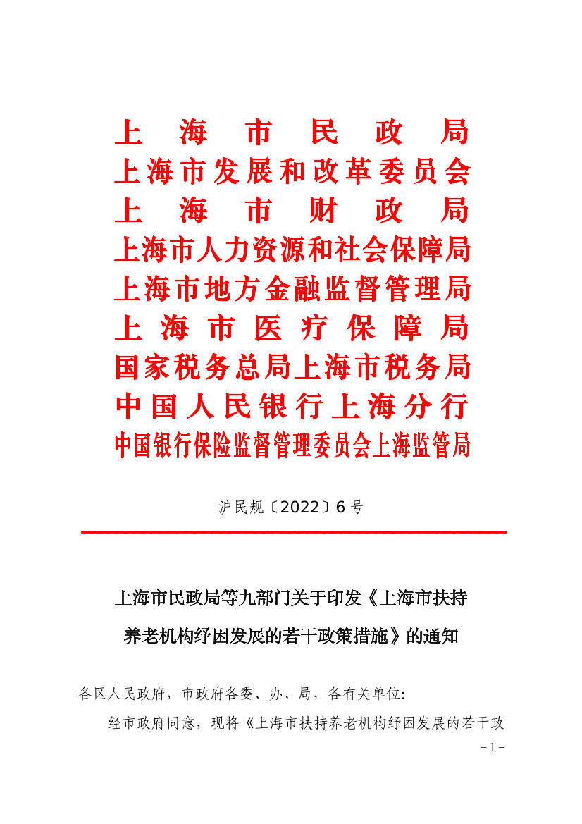 为贯彻落实党中央、国务院和市委、市政府决策部署,缓解本市养老机构在疫情防控中面临的阶段性困难,提振养老服务行业发展信心,在全面落实《上海市人民政府办公厅关于印发〈上海市全力抗疫情助企业促发展的若干政策措施〉的通知》(沪府办规〔2022〕5号)和《上海市人民政府关于印发〈上海市加快经济恢复和重振行动方案〉的通知》(沪府规〔2022〕5号)等文件要求的基础上,现就扶持本市养老机构纾困发展提出若干政策措施如下: