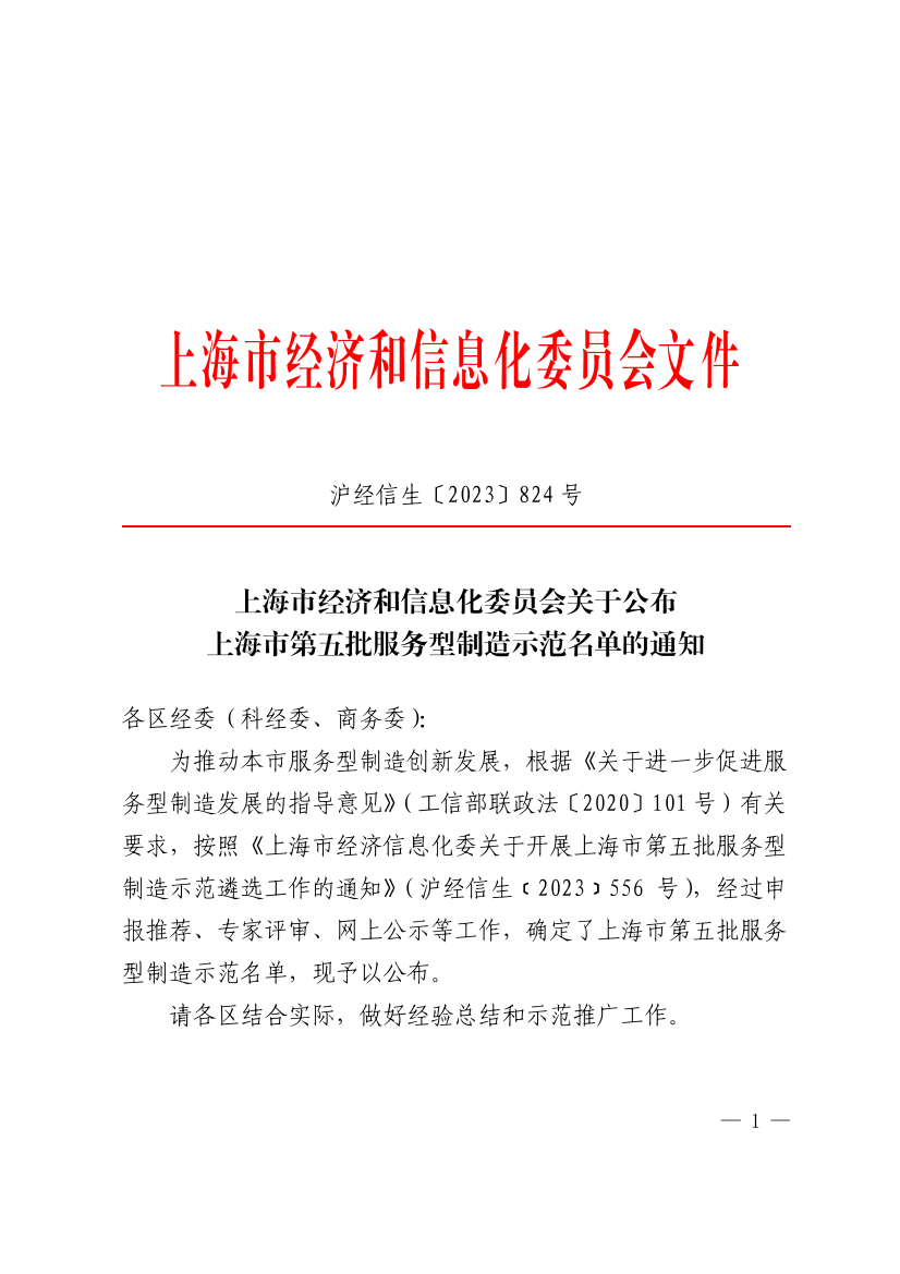 为推动本市服务型制造创新发展,根据《关于进一步促进服务型制造发展的指导意见》(工信部联政法〔2020〕101号)有关要求,按照《上海市经济信息化委关于开展上海市第五批服务型制造示范遴选工作的通知》(沪经信生﹝2023﹞556号),经过申报推荐、专家评审、网上公示等工作,确定了上海市第五批服务型制造示范名单,现予以公布。