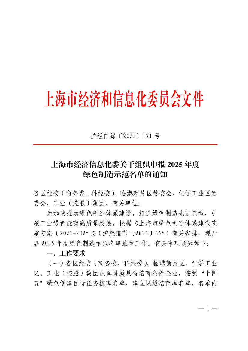 为加快推动绿色制造体系建设,打造绿色制造先进典型,引领工业绿色低碳高质量发展,根据《上海市绿色制造体系建设实施方案(2021-2025)》(沪经信节〔2021〕465)有关安排,现开展2025年度绿色制造示范名单推荐工作。有关事项通知如下: