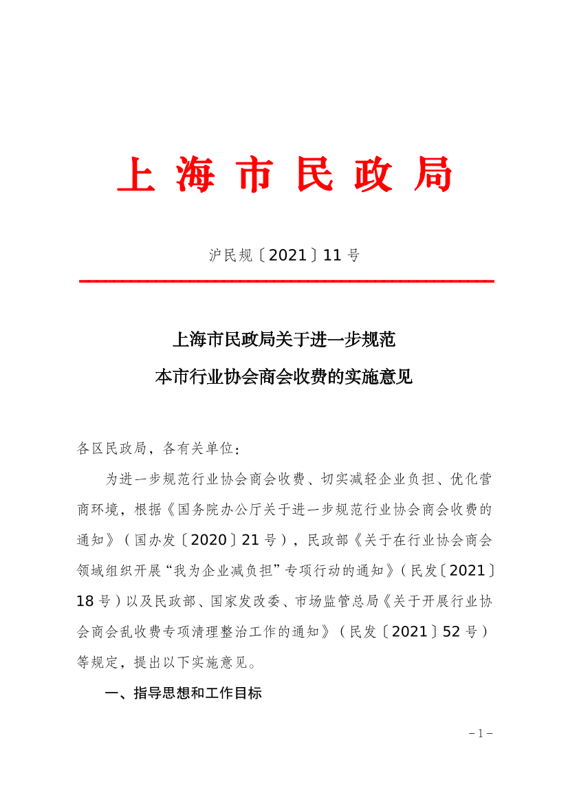 为进一步规范行业协会商会收费、切实减轻企业负担、优化营商环境,根据《国务院办公厅关于进一步规范行业协会商会收费的通知》(国办发〔2020〕21号),民政部《关于在行业协会商会领域组织开展“我为企业减负担”专项行动的通知》(民发〔2021〕18号)以及民政部、国家发改委、市场监管总局《关于开展行业协会商会乱收费专项清理整治工作的通知》(民发〔2021〕52号)等规定,提出以下实施意见。