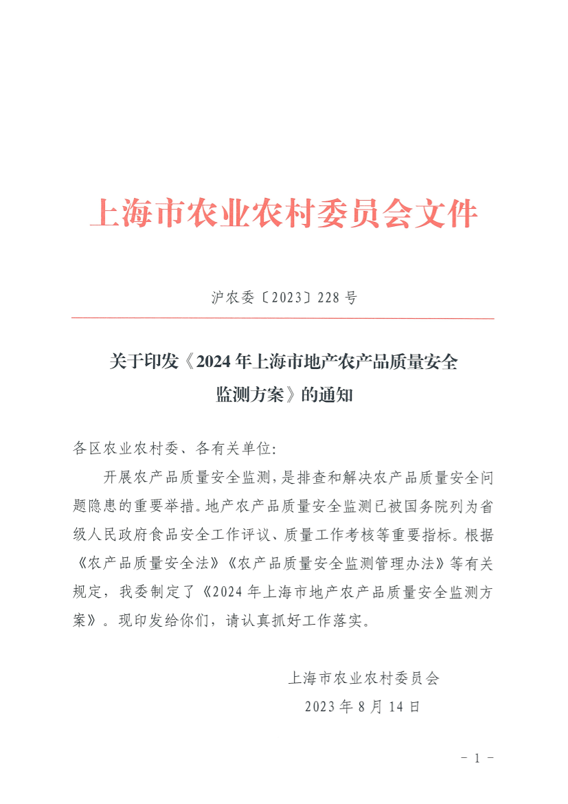 开展农产品质量安全监测,是排查和解决农产品质量安全问题隐患的重要举措。地产农产品质量安全监测已被国务院列为省级人民政府食品安全工作评议、质量工作考核等重要指标。根据《农产品质量安全法》《农产品质量安全监测管理办法》等有关规定,我委制定了《2024年上海市地产农产品质量安全监测方案》。现印发给你们,请认真抓好工作落实。