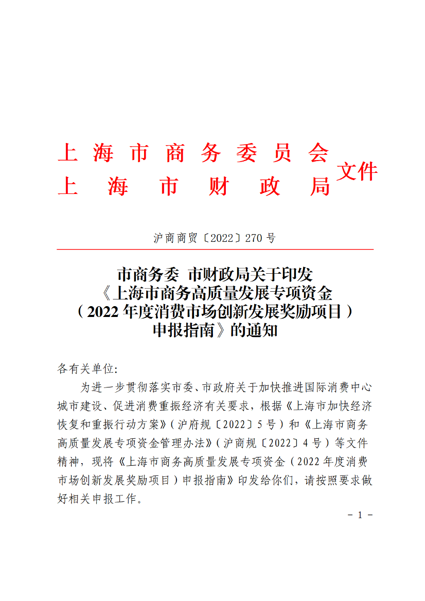 为进一步贯彻落实市委、市政府关于加快推进国际消费中心城市建设、促进消费重振经济有关要求,根据《上海市加快经济恢复和重振行动方案》(沪府规〔2022〕5号)和《上海市商务高质量发展专项资金管理办法》(沪商规〔2022〕4号)等文件精神,现将《上海市商务高质量发展专项资金(2022年度消费市场创新发展奖励项目)申报指南》印发给你们,请按照要求做好相关申报工作。