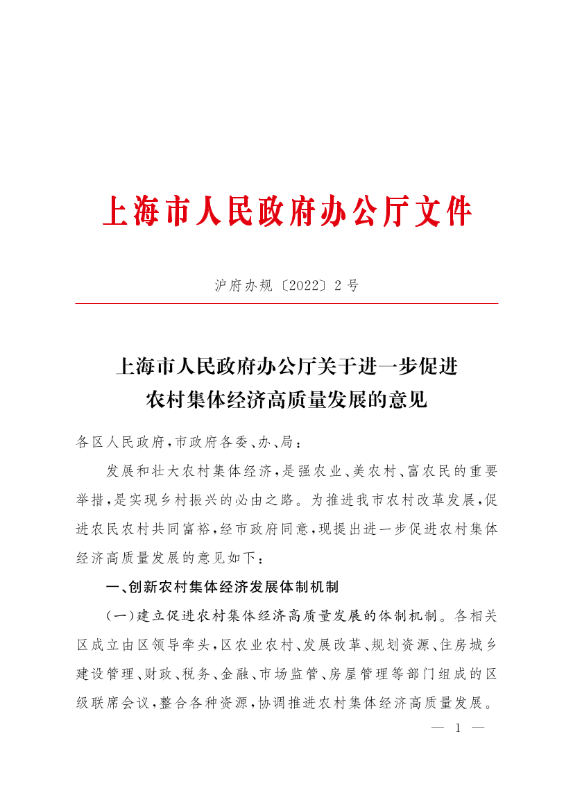 上海市人民政府办公厅关于进一步促进农村集体经济高质量发展的意见