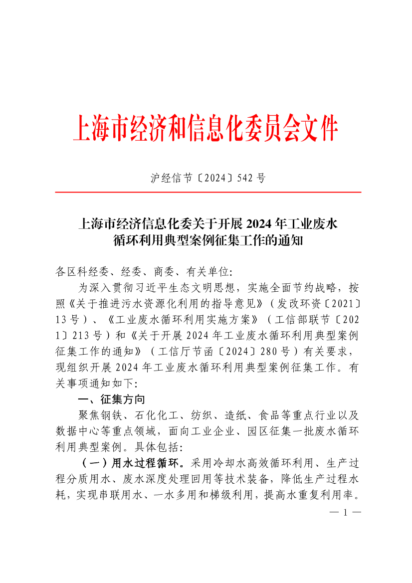 为深入贯彻习近平生态文明思想,实施全面节约战略,按照《关于推进污水资源化利用的指导意见》(发改环资〔2021〕13号)、《工业废水循环利用实施方案》(工信部联节〔2021〕213号)和《关于开展2024年工业废水循环利用典型案例征集工作的通知》(工信厅节函〔2024〕280号)有关要求,现组织开展2024年工业废水循环利用典型案例征集工作。有关事项通知如下: