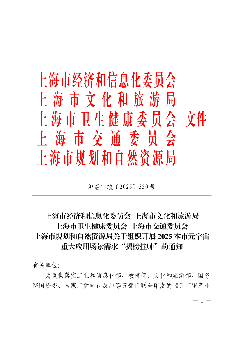 为贯彻落实工业和信息化部、教育部、文化和旅游部、国务院国资委、国家广播电视总局等五部门联合印发的《元宇宙产业创新发展三年行动计划(2023—2025年)》以及《上海市培育“元宇宙”新赛道行动方案》,推动更多元宇宙应用场景落地,牵引带动元宇宙相关产业高质量发展,市经济信息化委、市文化旅游局、市卫生健康委、市交通委、市规划资源局联合开展本市第三批元宇宙重大应用场景需求“揭榜挂帅”工作。通知如下: