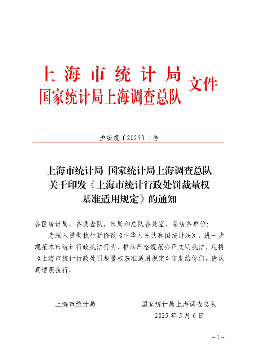 为深入贯彻执行新修改《中华人民共和国统计法》,进一步规范本市统计行政执法行为,推动严格规范公正文明执法,现将《上海市统计行政处罚裁量权基准适用规定》印发给你们,请认真遵照执行。