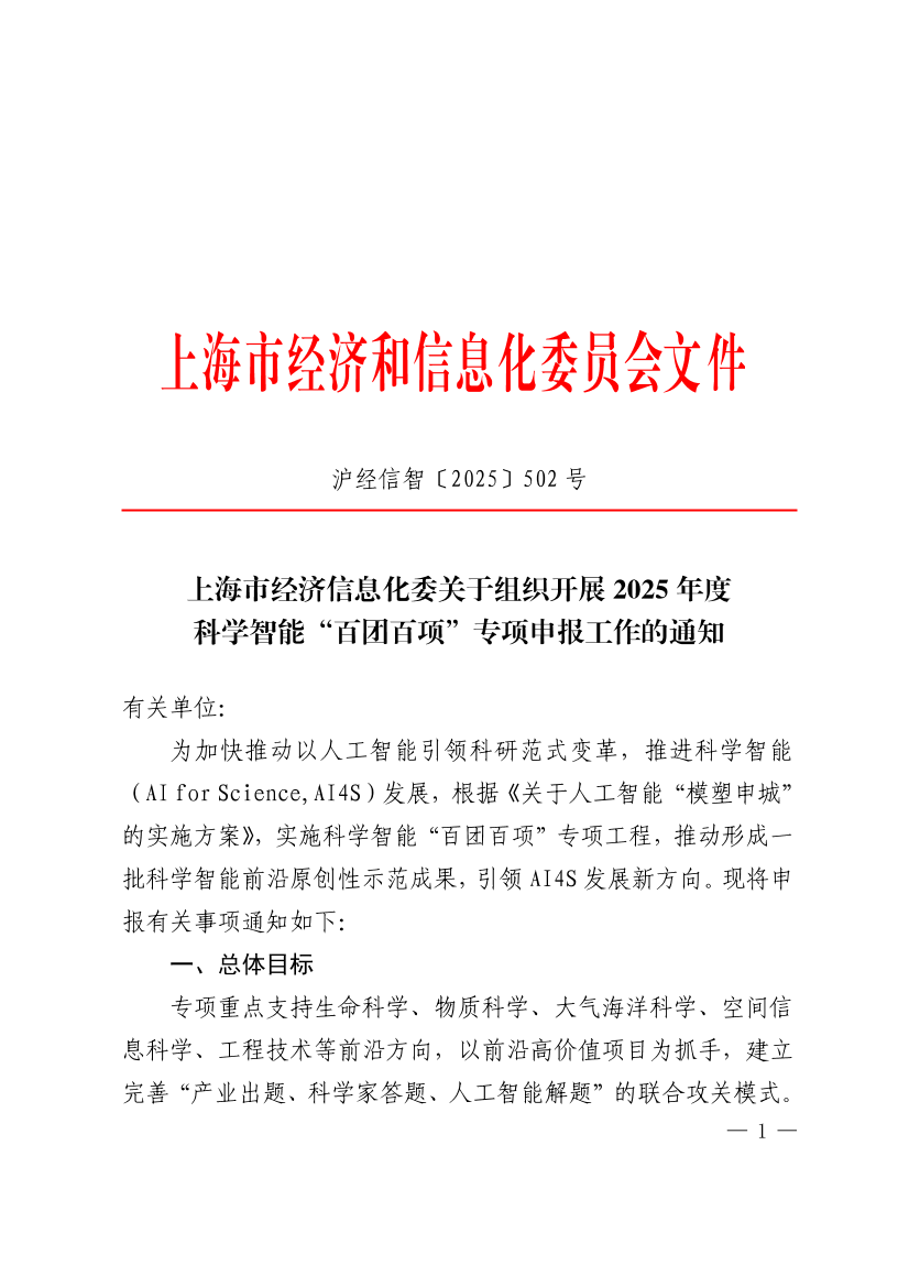 上海市经济信息化委关于组织开展2025年度科学智能“百团百项”专项申报工作的通知