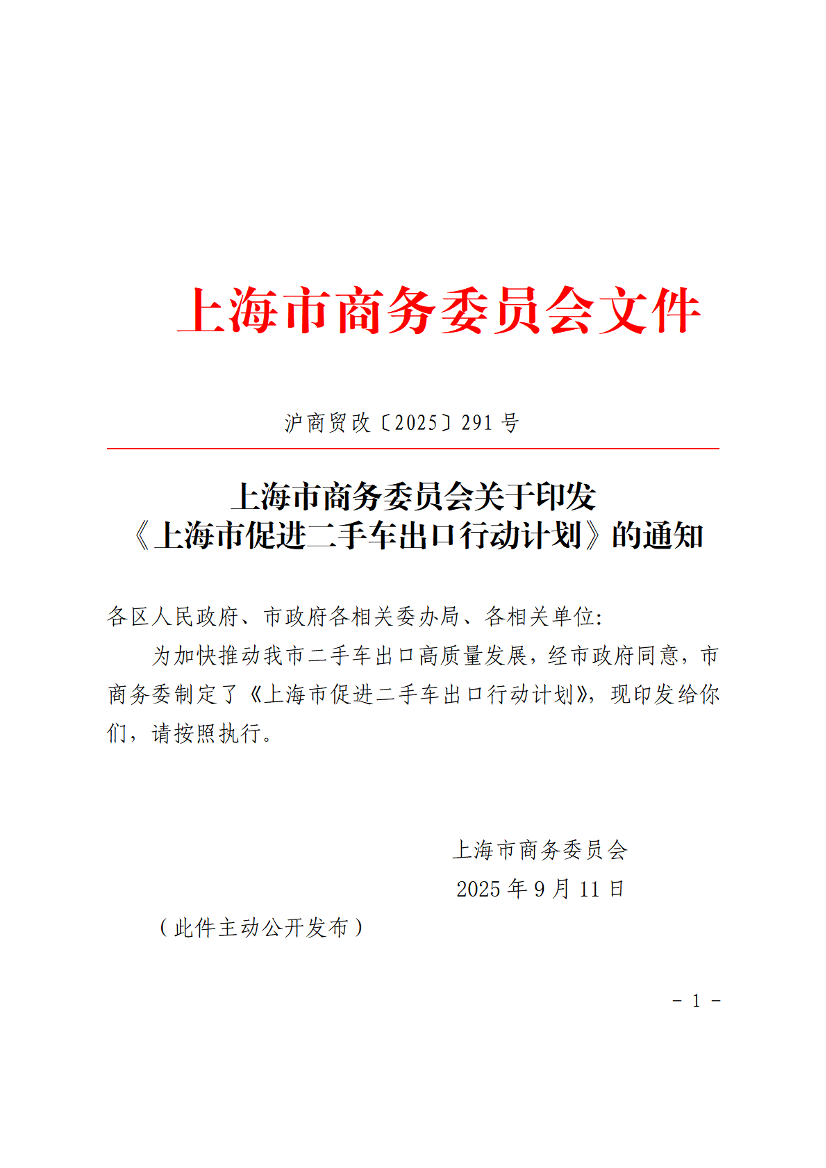 为加快推动我市二手车出口高质量发展,经市政府同意,市商务委制定了《上海市促进二手车出口行动计划》,现印发给你们,请按照执行。
