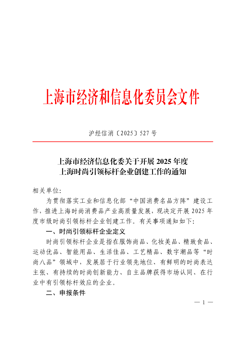 为贯彻落实工业和信息化部“中国消费名品方阵”建设工作,推进上海时尚消费品产业高质量发展,现决定开展2025年度市级时尚引领标杆企业创建工作。有关事项通知如下: