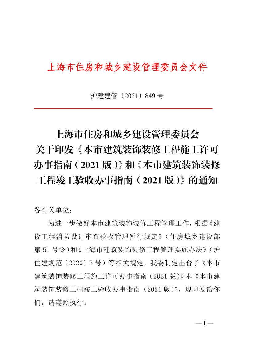 为进一步做好本市建筑装饰装修工程管理工作,根据《建设工程消防设计审查验收管理暂行规定》(住房城乡建设部第51号令)和《上海市建筑装饰装修工程管理实施办法》(沪住建规范〔2020〕3号)等相关规定,我委制定出台了《本市建筑装饰装修工程施工许可办事指南(2021版)》和《本市建筑装饰装修工程竣工验收办事指南(2021版)》,现印发给你们,请遵照执行。