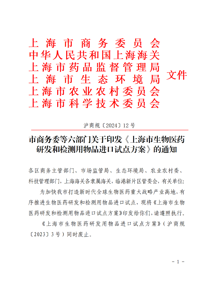 为加快我市打造新时代全球生物医药重大战略产业高地,有序推进生物医药研发和检测用物品进口试点,现将《上海市生物医药研发和检测用物品进口试点方案》印发给你们,请遵照执行。