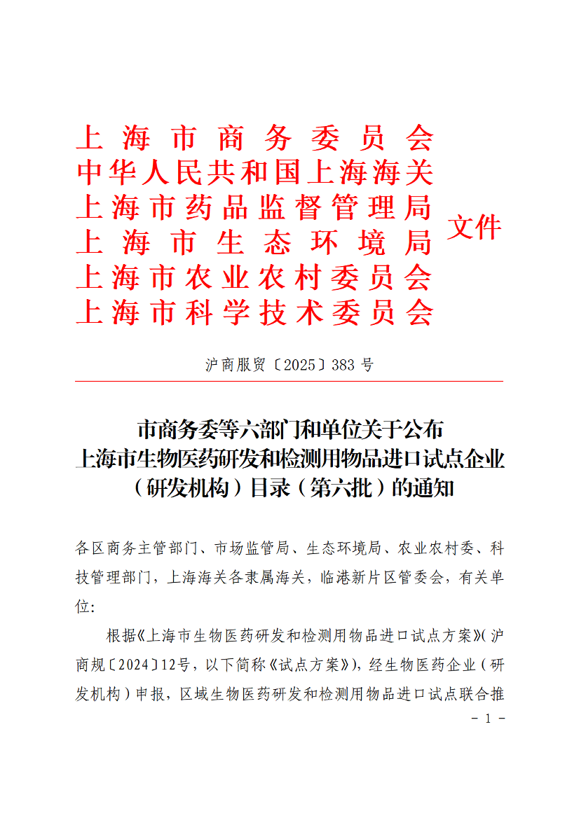 根据《上海市生物医药研发和检测用物品进口试点方案》(沪商规〔2024〕12号,以下简称《试点方案》),经生物医药企业(研发机构)申报,区域生物医药研发和检测用物品进口试点联合推进机制推荐,市级生物医药研发和检测用物品进口试点联合推进机制(以下简称“市级联合推进机制”)认定,现公布上海市生物医药研发和检测用物品进口试点企业(研发机构)目录(第六批)。