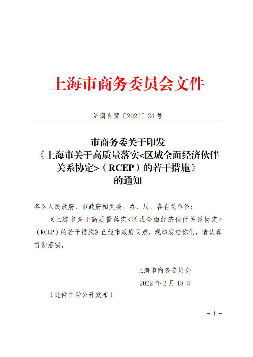 关于印发《上海市关于高质量落实〈区域全面经济伙伴关系协定〉(RCEP)的若干措施》的通知