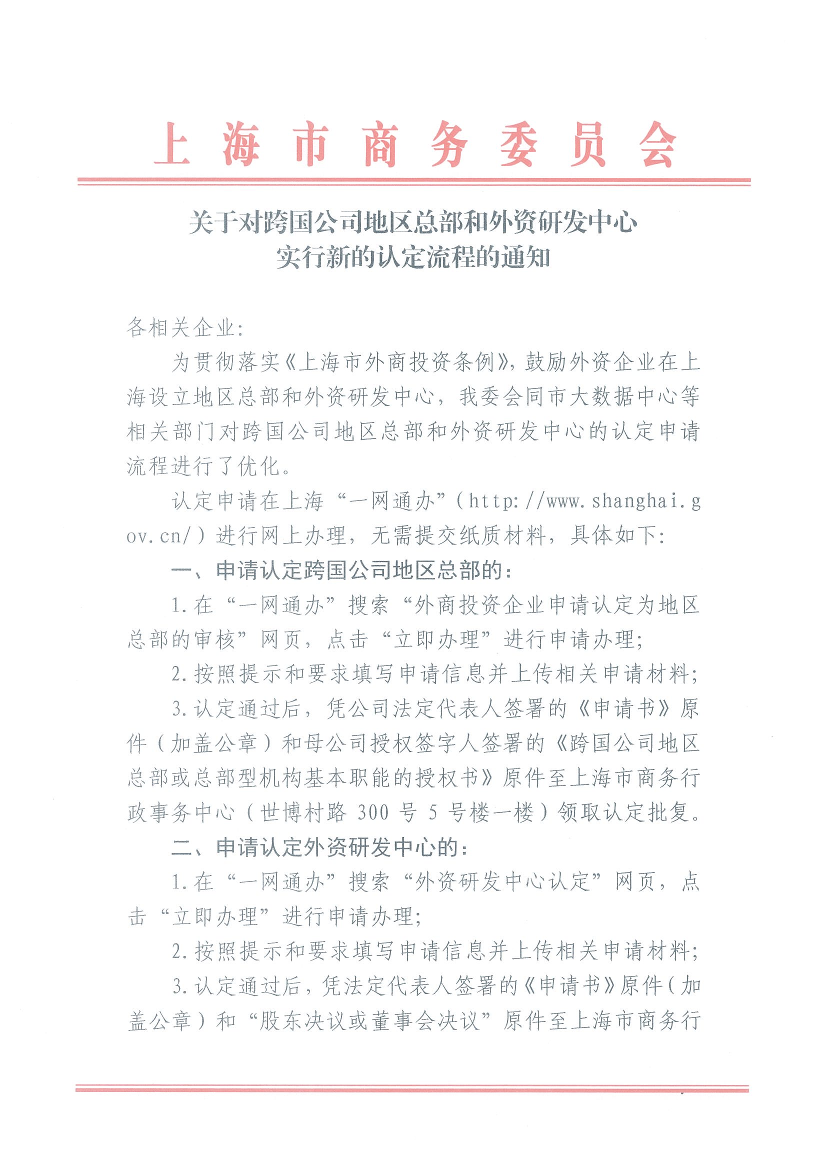 关于对跨国公司地区总部和外资研发中心实行新的认定流程的通知