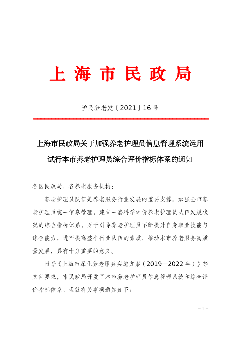 根据《上海市深化养老服务实施方案(2019—2022年)》等文件要求,市民政局开发了本市养老护理员信息管理系统和综合评价指标体系。现就有关事项通知如下: