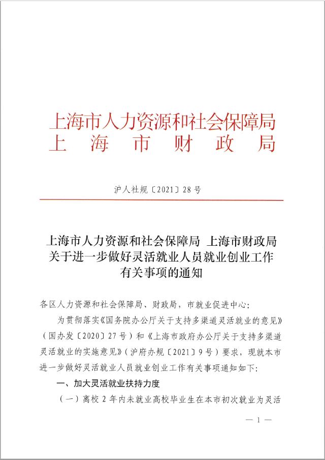 为贯彻落实《国务院办公厅关于支持多渠道灵活就业的意见》(国办发〔2020〕27号)和《上海市政府办公厅关于支持多渠道灵活就业的实施意见》(沪府办规〔2021〕9号)要求,现就本市进一步做好灵活就业人员就业创业工作有关事项通知如下:
