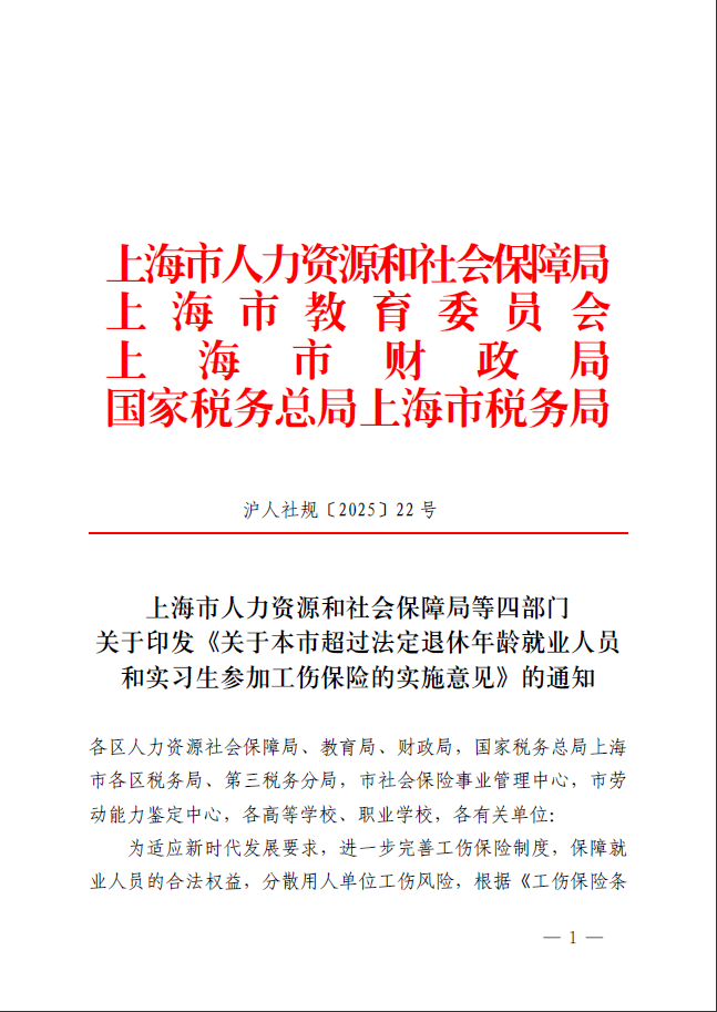 为适应新时代发展要求,进一步完善工伤保险制度,保障就业人员的合法权益,分散用人单位工伤风险,根据《工伤保险条例》《上海市工伤保险实施办法》,结合本市实际,现就本市超过法定退休年龄就业人员(以下简称“超龄就业人员”)和实习生参加工伤保险提出实施意见,现印发给你们,请遵照执行。