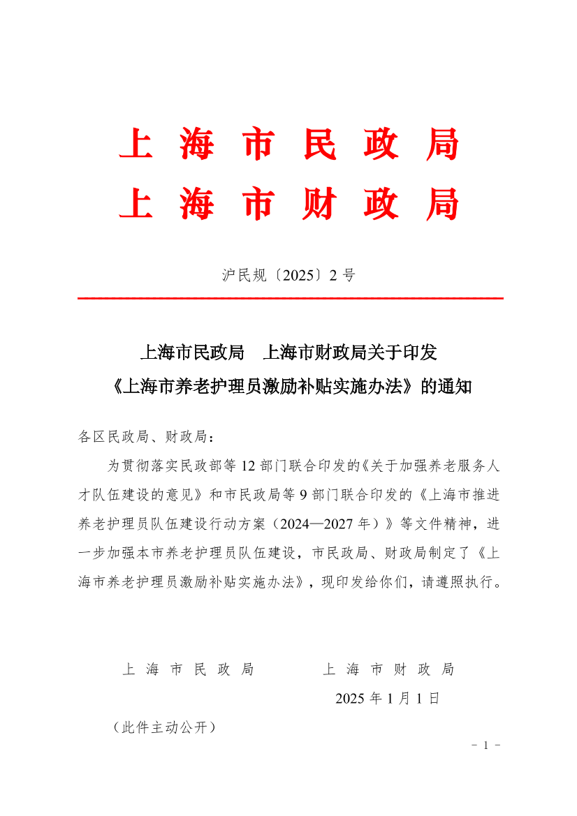 为贯彻落实民政部等12部门联合印发的《关于加强养老服务人才队伍建设的意见》和市民政局等9部门联合印发的《上海市推进养老护理员队伍建设行动方案(2024—2027年)》等文件精神,进一步加强本市养老护理员队伍建设,市民政局、财政局制定了《上海市养老护理员激励补贴实施办法》,现印发给你们,请遵照执行。