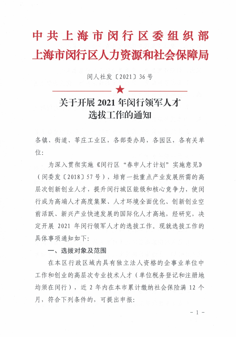 为深入贯彻实施《闵行区“春申人才计划”实施意见》(闵委发〔2018〕57号),培育一批重点产业发展所需的高层次创新创业人才,提升闵行城区能级和核心竞争力,使闵行成为高端人才高度集聚、人才环境全面优化、创新创业空前活跃、新兴产业快速发展的国际化人才高地,经研究,决定开展2021年闵行领军人才的选拔工作。现就选拔工作的具体事项通知如下: