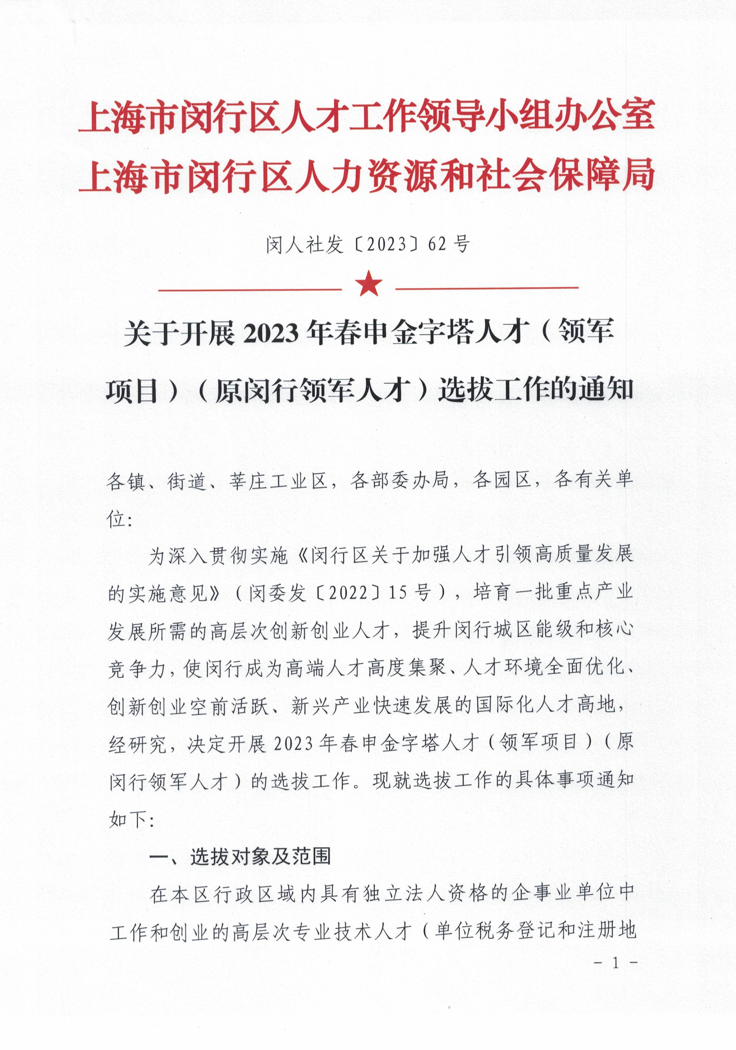 为深入贯彻实施《闵行区关于加强人才引领高质量发展的实施意见》(闵委发〔2022〕15号),培育一批重点产业发展所需的高层次创新创业人才,提升闵行城区能级和核心竞争力,使闵行成为高端人才高度集聚、人才环境全面优化、创新创业空前活跃、新兴产业快速发展的国际化人才高地,经研究,决定开展2023年春申金字塔人才(领军项目)(原闵行领军人才)的选拔工作。现就选拔工作的具体事项通知如下: