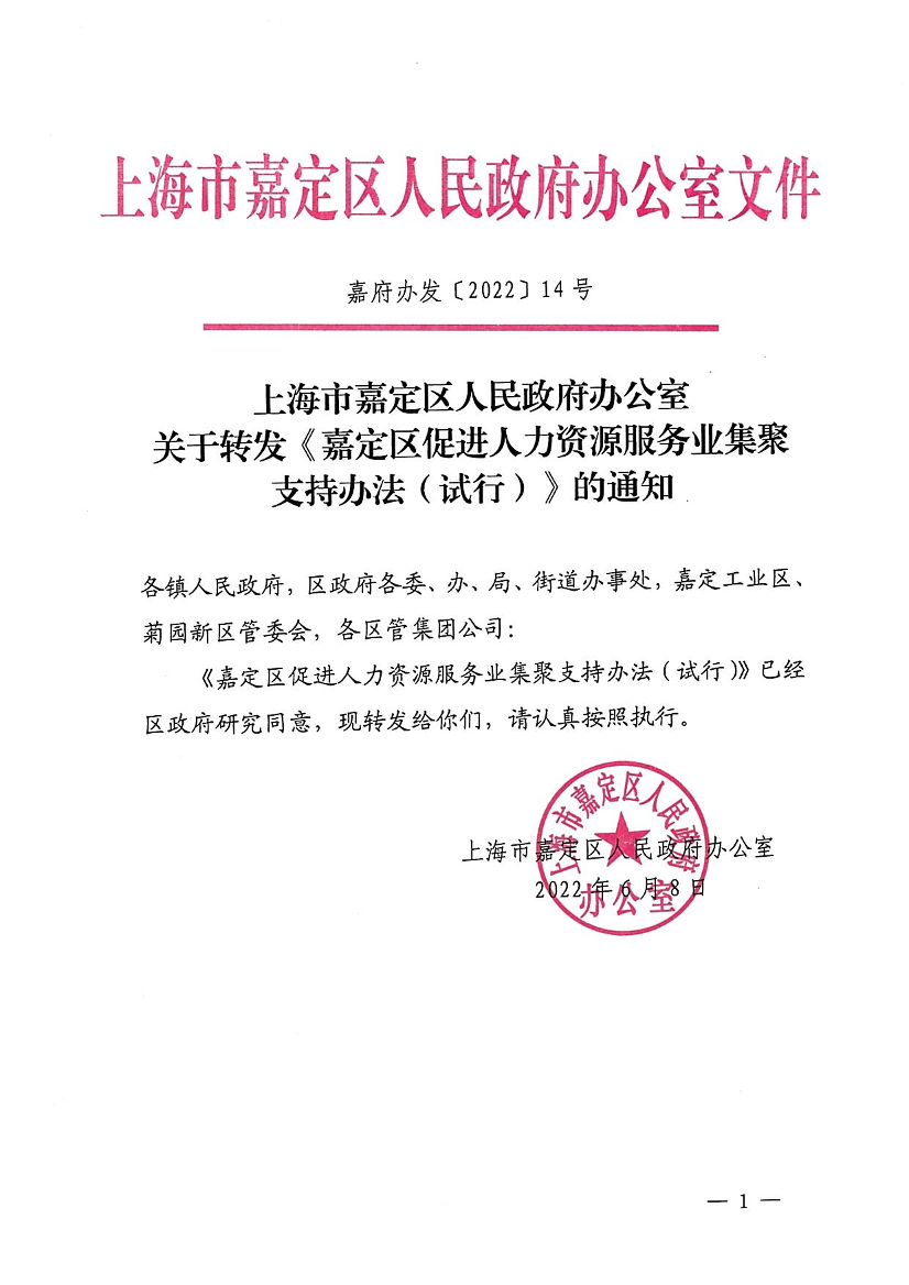 《嘉定区促进人力资源服务业集聚支持办法(试行)》已经区政府研究同意,现转发给你们,请认真按照执行。