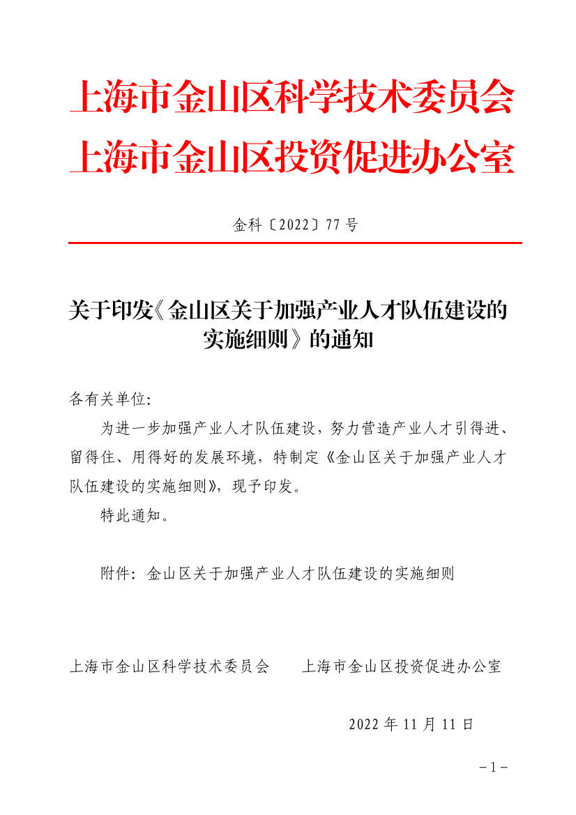 关于印发《金山区关于加强产业人才队伍建设的实施细则》的通知