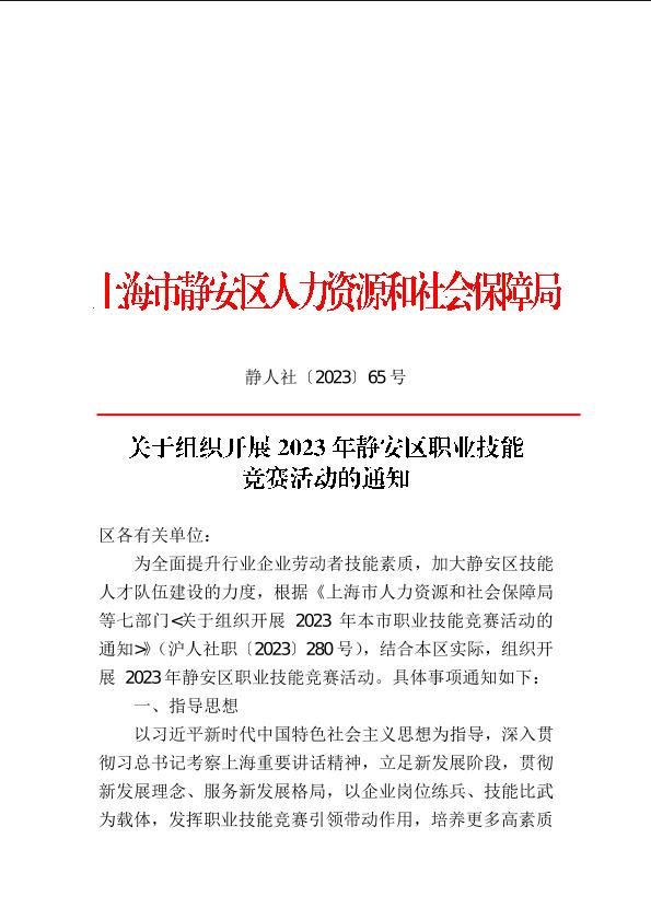 为全面提升行业企业劳动者技能素质,加大静安区技能人才队伍建设的力度,根据《上海市人力资源和社会保障局等七部门<关于组织开展2023年本市职业技能竞赛活动的通知>》(沪人社职〔2023〕280号),结合本区实际,组织开展2023年静安区职业技能竞赛活动。具体事项通知如下: