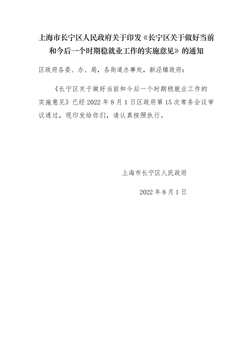 《长宁区关于做好当前和今后一个时期稳就业工作的实施意见》已经2022年8月1日区政府第15次常务会议审议通过,现印发给你们,请认真按照执行。