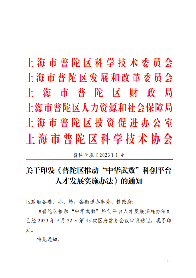 普陀区推动“中华武数”科创平台人才发展实施办法