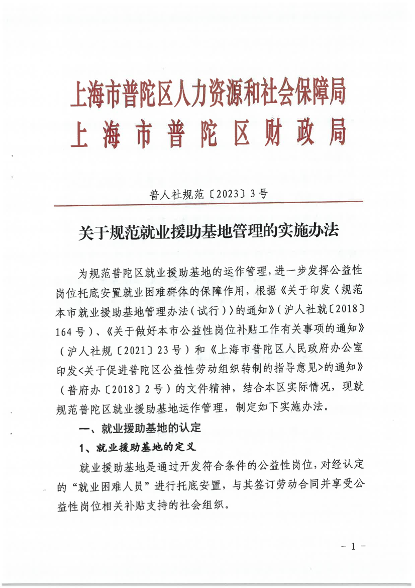 为规范普陀区就业援助基地的运作管理,进一步发挥公益性岗位托底安置就业困难群体的保障作用,根据《关于印发〈规范本市就业援助基地管理办法(试行)〉的通知》(沪人社就〔2018〕164号)、《关于做好本市公益性岗位补贴工作有关事项的通知》(沪人社规〔2021〕23号)和《上海市普陀区人民政府办公室印发<关于促进普陀区公益性劳动组织转制的指导意见>的通知》(普府办〔2018〕2号)的文件精神,结合本区实际情况,现就规范普陀区就业援助基地运作管理,制定如下实施办法。