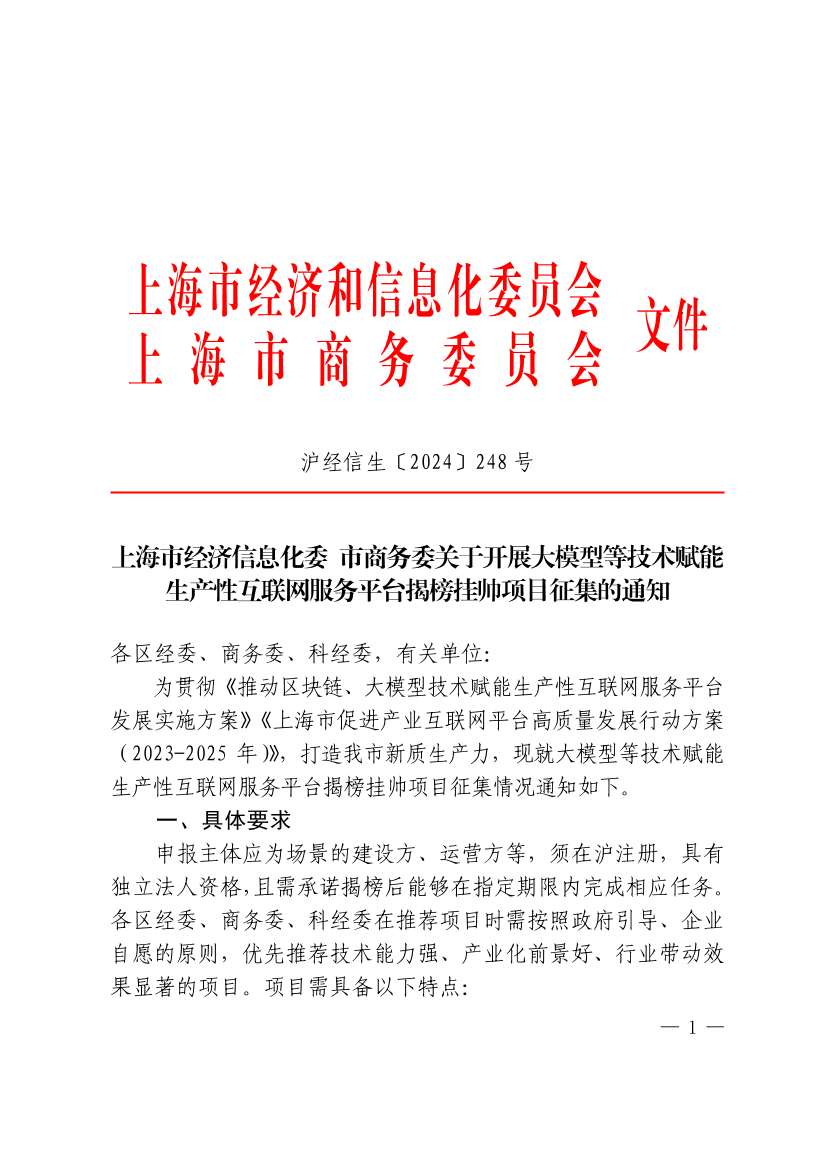为贯彻《推动区块链、大模型技术赋能生产性互联网服务平台发展实施方案》《上海市促进产业互联网平台高质量发展行动方案(2023-2025 年)》,打造我市新质生产力,现就大模型等技术赋能生产性互联网服务平台揭榜挂帅项目征集情况通知如下。