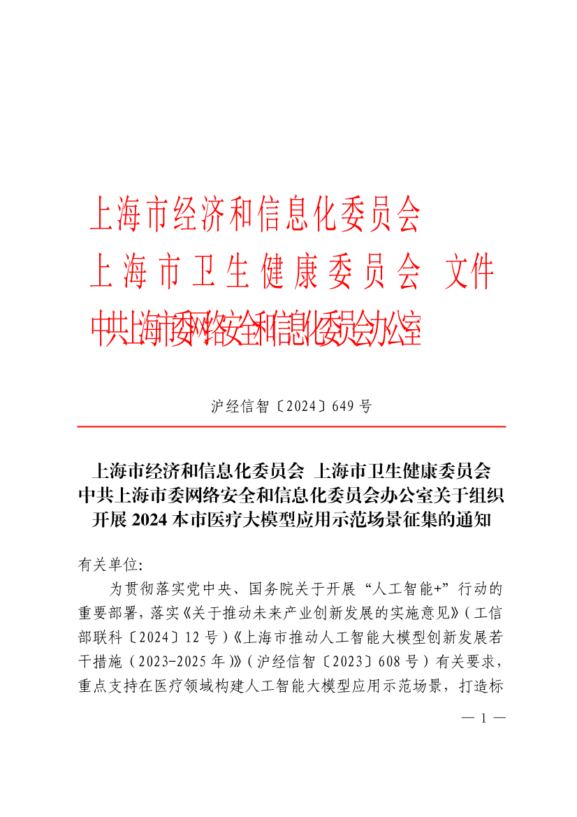 为贯彻落实党中央、国务院关于开展“人工智能+”行动的重要部署,落实《关于推动未来产业创新发展的实施意见》(工信部联科〔2024〕12号)《上海市推动人工智能大模型创新发展若干措施(2023-2025年)》(沪经信智〔2023〕608号)有关要求,重点支持在医疗领域构建人工智能大模型应用示范场景,打造标杆性大模型产品和服务,市经济信息化委、市卫生健康委、市委网信办拟联合开展2024年本市医疗大模型应用示范场景征集工作,由中国信通院上海工创中心负责组织管理工作。通知如下: