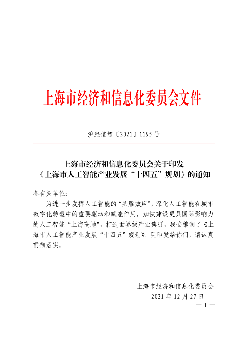 为进一步发挥人工智能的“头雁效应”,深化人工智能在城市数字化转型中的重要驱动和赋能作用,加快建设更具国际影响力的人工智能“上海高地”,打造世界级产业集群,我委编制了《上海市人工智能产业发展“十四五”规划》。现印发给你们,请认真贯彻落实。