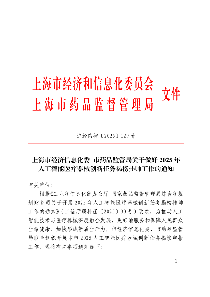 根据《工业和信息化部办公厅 国家药品监督管理局综合和规划财务司关于开展2025年人工智能医疗器械创新任务揭榜挂帅工作的通知》(工信厅联科函〔2025〕30号)要求,为推动人工智能技术与医疗器械深度融合发展,更好地服务和保障人民群众生命健康,加快形成新质生产力,市经济信息化委、市药品监管局联合组织开展本市2025人工智能医疗器械创新任务揭榜申报工作。现将有关事项通知如下: