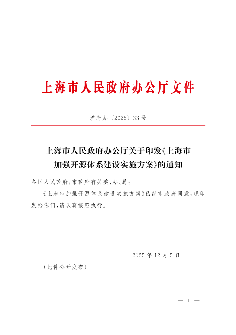 《上海市加强开源体系建设实施方案》已经市政府同意,现印发给你们,请认真按照执行。
