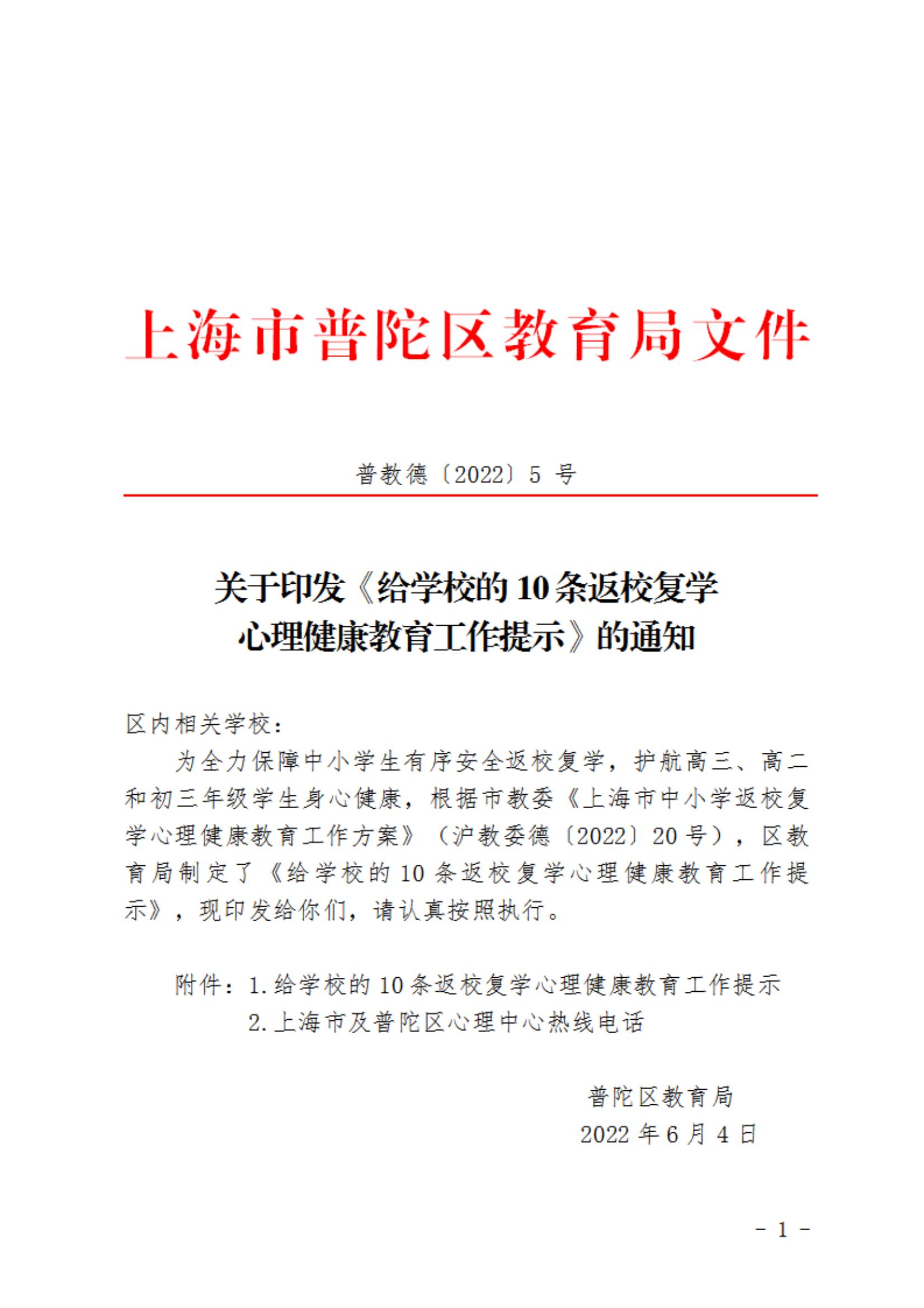 为全力保障中小学生有序安全返校复学,护航高三、高二和初三年级学生身心健康,根据市教委《上海市中小学返校复学心理健康教育工作方案》(沪教委德〔2022〕20号),区教育局制定了《给学校的10条返校复学心理健康教育工作提示》,现印发给你们,请认真按照执行。