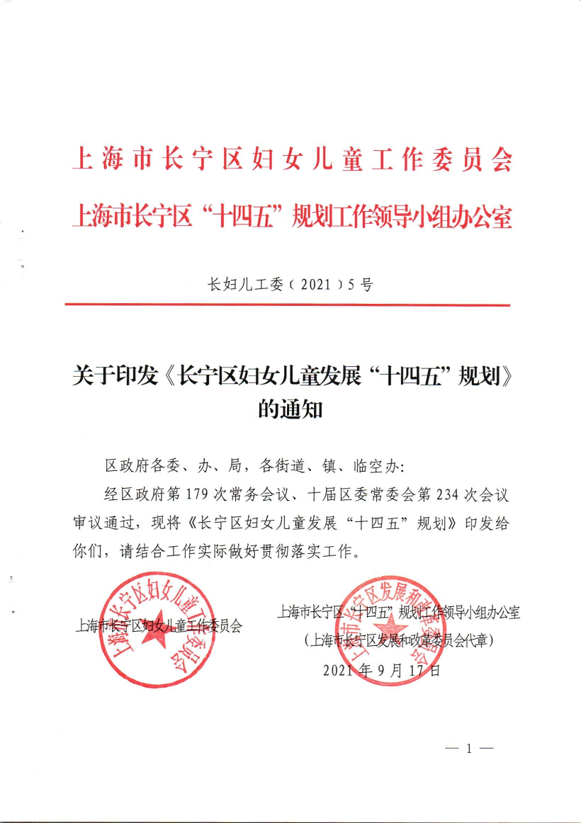 关于印发《长宁区妇女儿童发展“十四五”规划》的通知