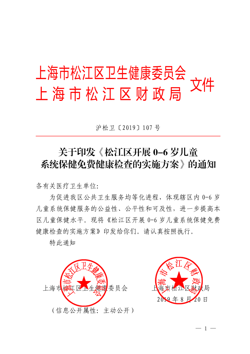 关于印发《松江区开展0-6岁儿童系统保健免费健康检查的实施方案》的通知