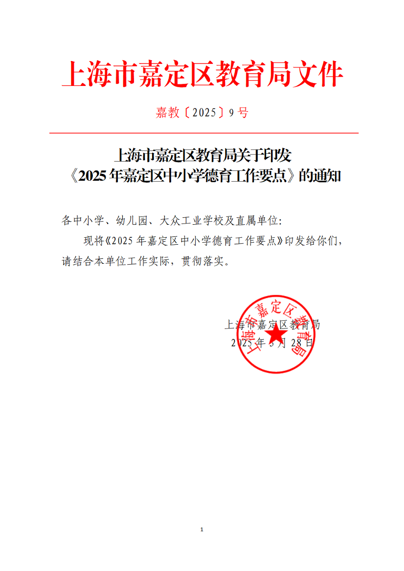 现将《2025年嘉定区中小学德育工作要点》印发给你们,请结合本单位工作实际,贯彻落实。