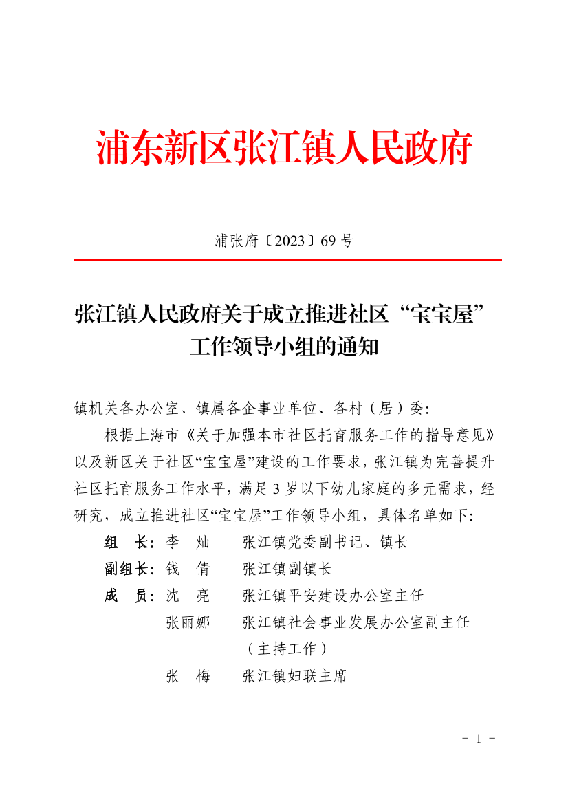 根据上海市《关于加强本市社区托育服务工作的指导意见》以及新区关于社区“宝宝屋”建设的工作要求,张江镇为完善提升社区托育服务工作水平,满足3岁以下幼儿家庭的多元需求,经研究,成立推进社区“宝宝屋”工作领导小组,具体名单如下: