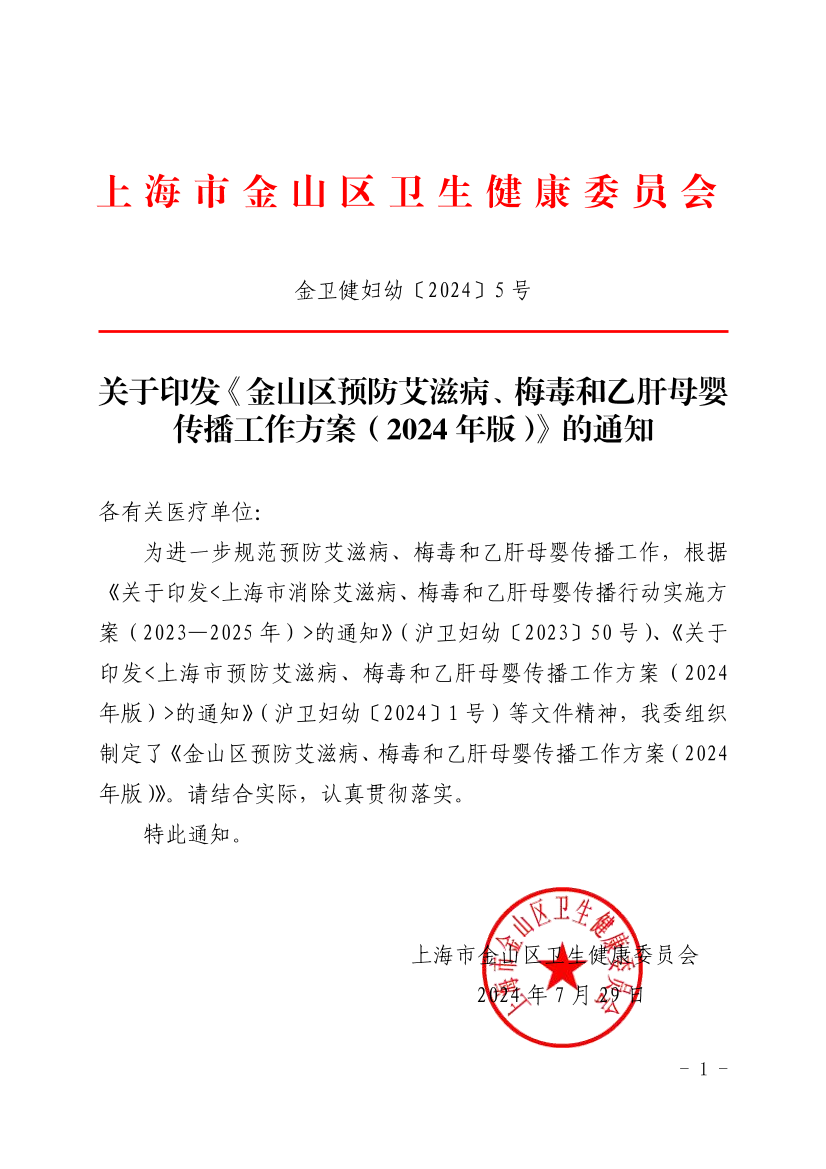 关于印发《金山区预防艾滋病、梅毒和乙肝母婴传播工作方案(2024年版)》的通知