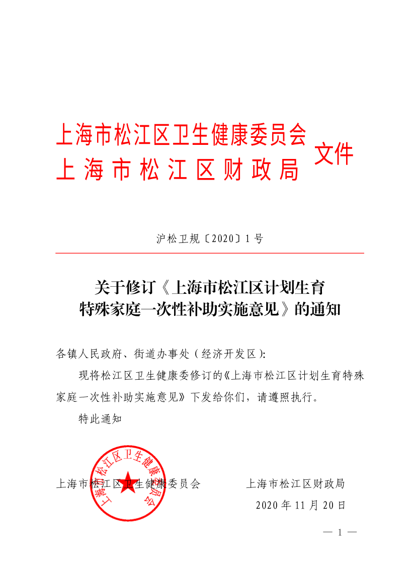 现将松江区卫生健康委修订的《上海市松江区计划生育特殊家庭一次性补助实施意见》下发给你们,请遵照执行。