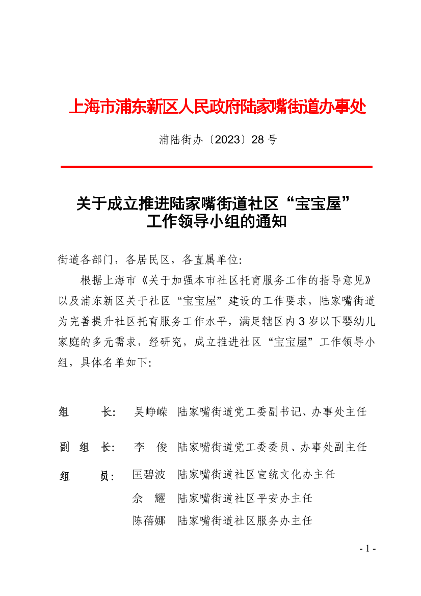 根据上海市《关于加强本市社区托育服务工作的指导意见》以及浦东新区关于社区“宝宝屋”建设的工作要求,陆家嘴街道为完善提升社区托育服务工作水平,满足辖区内3岁以下婴幼儿家庭的多元需求,经研究,成立推进社区“宝宝屋”工作领导小组,具体名单如下: