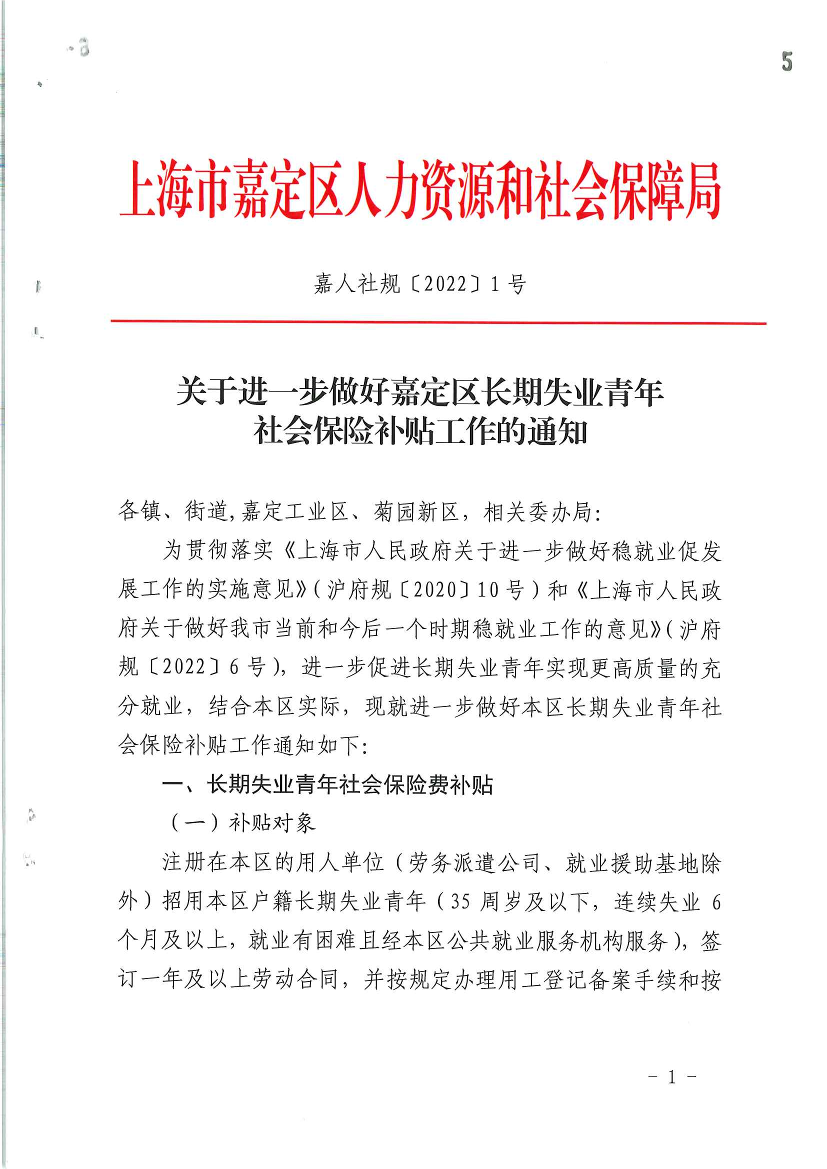 为贯彻落实《上海市人民政府关于进一步做好稳就业促发展工作的实施意见》(沪府规〔2020〕10号)和《上海市人民政府关于做好我市当前和今后一个时期稳就业工作的意见》(沪府规〔2022〕6号),进一步促进长期失业青年实现更高质量的充分就业,结合本区实际,现就进一步做好本区长期失业青年社会保险补贴工作通知如下: