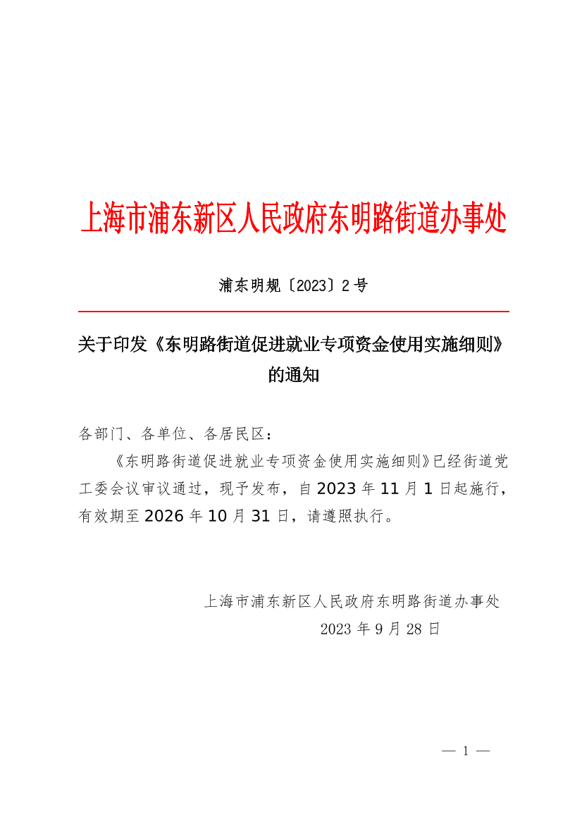 《东明路街道促进就业专项资金使用实施细则》已经街道党工委会议审议通过,现予发布,自2023年11月1日起施行,有效期至2026年10月31日,请遵照执行。