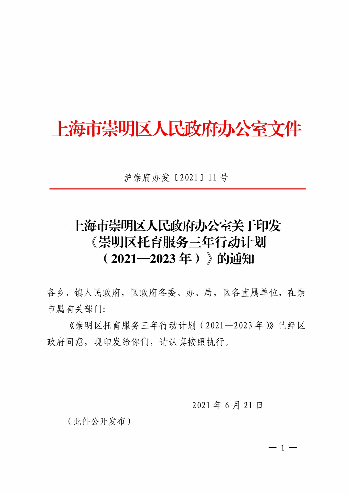 《崇明区托育服务三年行动计划(2021—2023年)》已经区政府同意,现印发给你们,请认真按照执行。