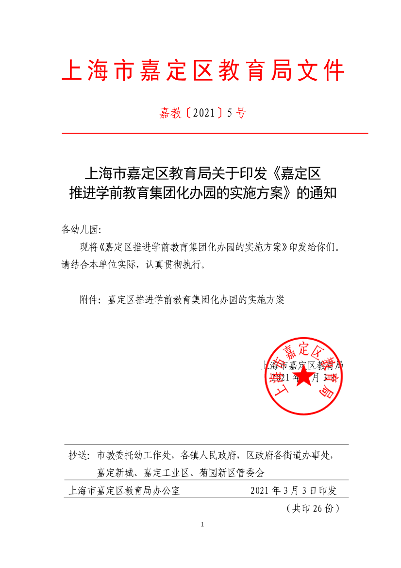 上海市嘉定区教育局关于印发《嘉定区推进学前教育集团化办园的实施方案》的通知